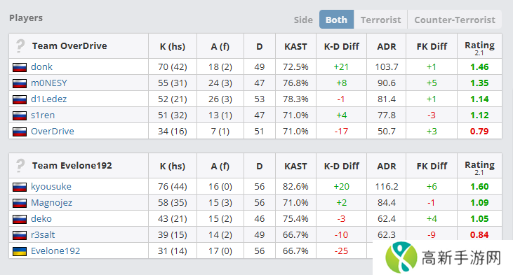 表演赛为BO3。kyousuke即使是在对阵donk、m0NESY,仍拿到了76的最高击杀数、1.60的最高Rating、82%的最高KAST和116.2的最高回合平均伤害。