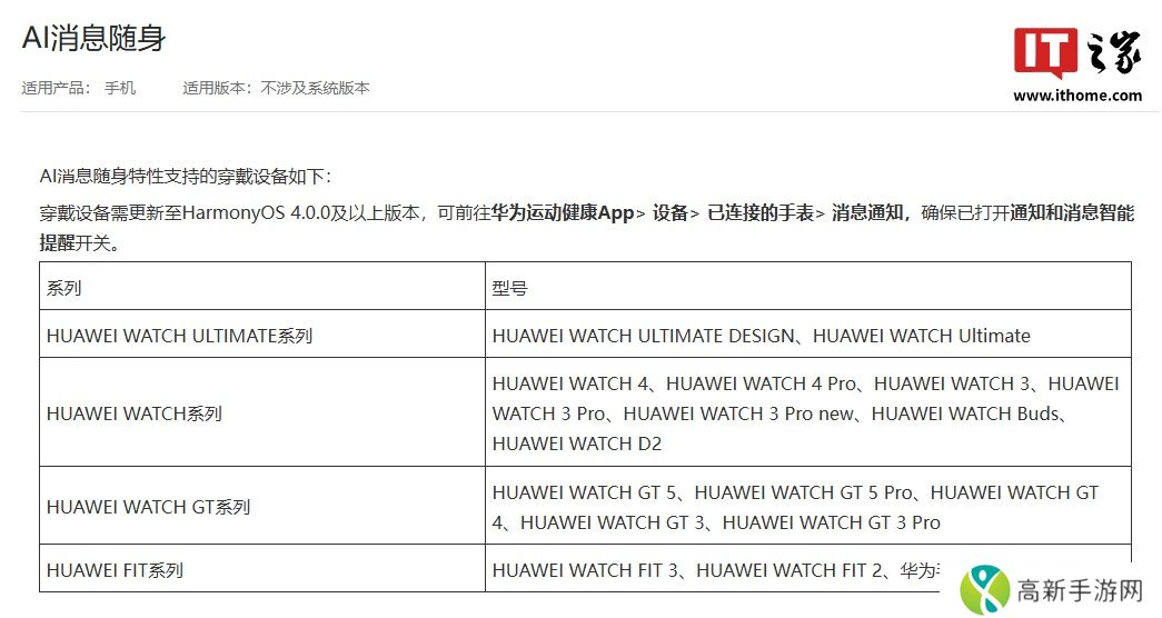 华为官网现更新了 AI 消息随身功能穿戴类设备适配情况,本站附详情如下: