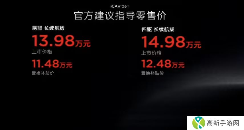 现款 iCAR 03T 于 8 月上市,官方指导价区间为 13.98 万-14.98 万元,后续在 11 月新增两驱长续航悦享版和四驱长续航悦享版,指导价分别为 15.58 万元和 16.58 万元。