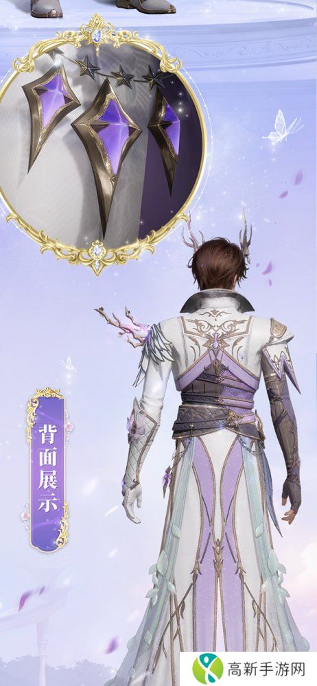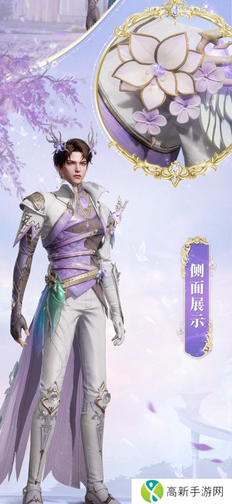男款【紫茉霜华】具有雅致的雕纹肩甲元素与盛开的花团装饰,整体设计梦幻而优雅。明亮的肩甲与花朵的光泽交相辉映,象征着骑士般守护爱情的坚韧决心,仿佛在光影交错中诉说着对爱的忠诚与守护。