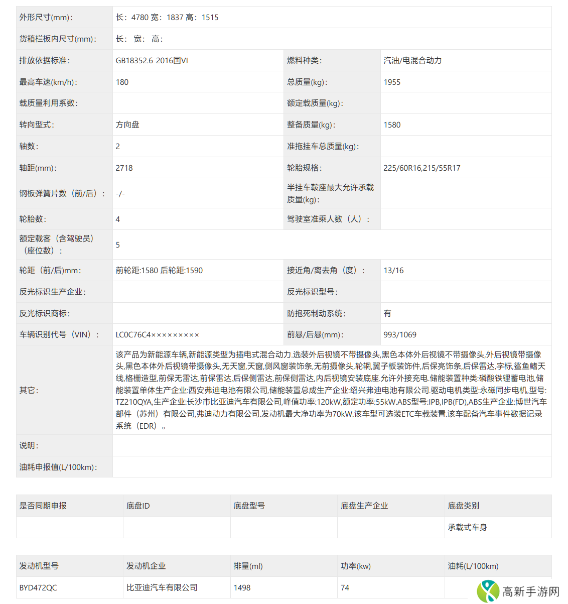新车采用全新样式的车头、车尾,长宽高分别为 4780/1837/1515mm,比现款加长 15mm、高度增高 20mm,轴距保持 2718mm 不变。新车搭载 1.5L 发动机(代号 BYD472QC),其最大功率为 74kW(现款为 81kW),电机最大功率为 120kW(现款为 132kW)。