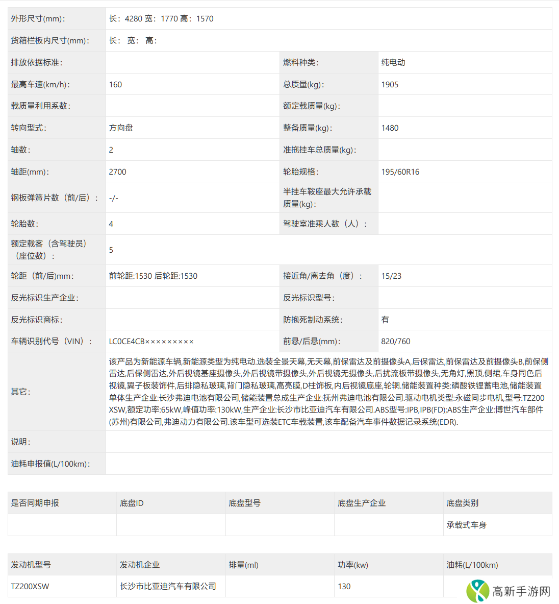 该车长宽高分别为 4280/1770/1570mm,轴距为 2700mm,搭载型号为 TZ200XSW 的驱动电机,最大功率为 130kW。续航参考现款车型提供 302km、401km、420km、520km。