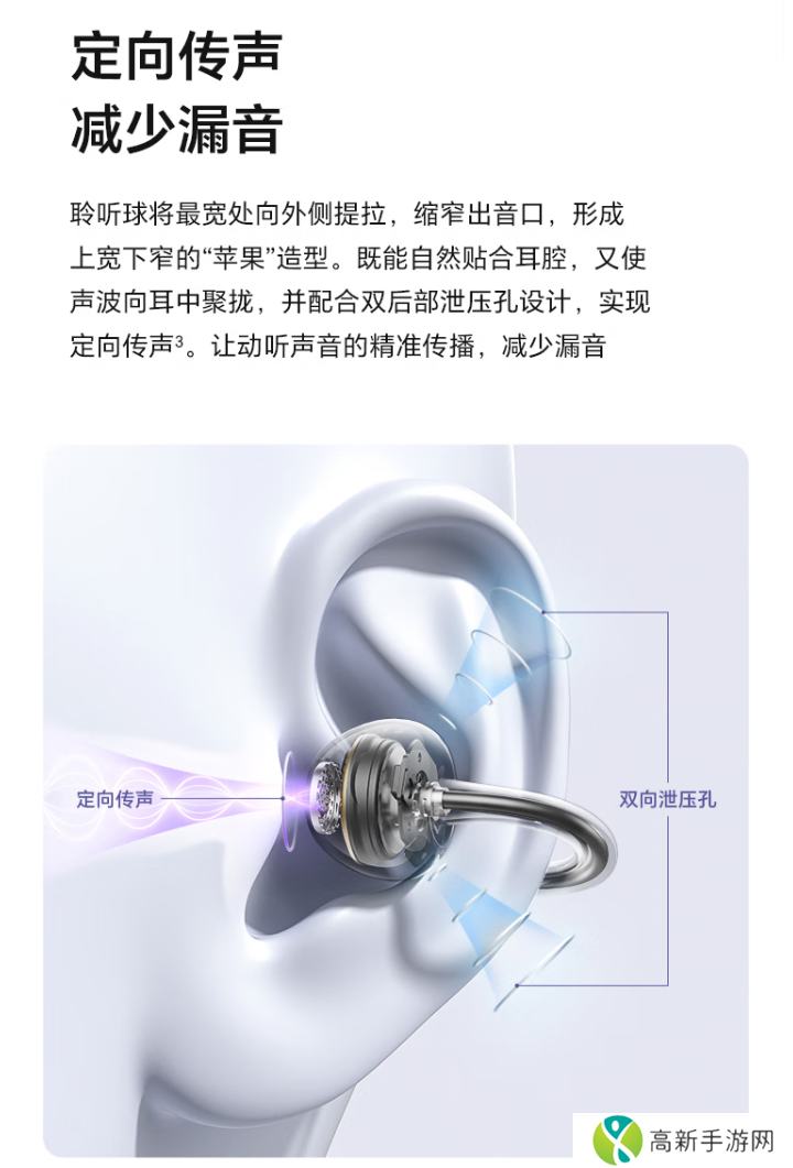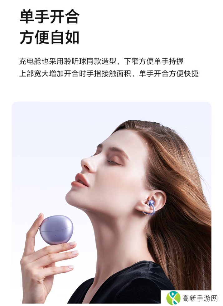 该款耳机采用上宽下窄的“苹果”造型,支持定向传声技术;充电舱采用聆听球同款造型,支持单手握持、开合。