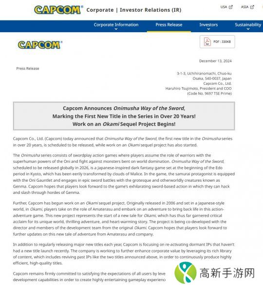 此外卡普空还强调:“该公司正致力于利用其丰富的内容库来进一步提升企业价值,其中包括复活《大神》和《鬼武者》等过去的IP,以便不断推出高效、高质量的作品。”