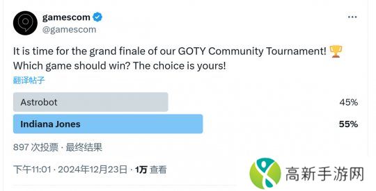 根据科隆官推,最终入围的两大游戏是《宇宙机器人》和《夺宝奇兵:古老之圈》,二者的得票率45% vs 55%,《夺宝奇兵》领先了10%。