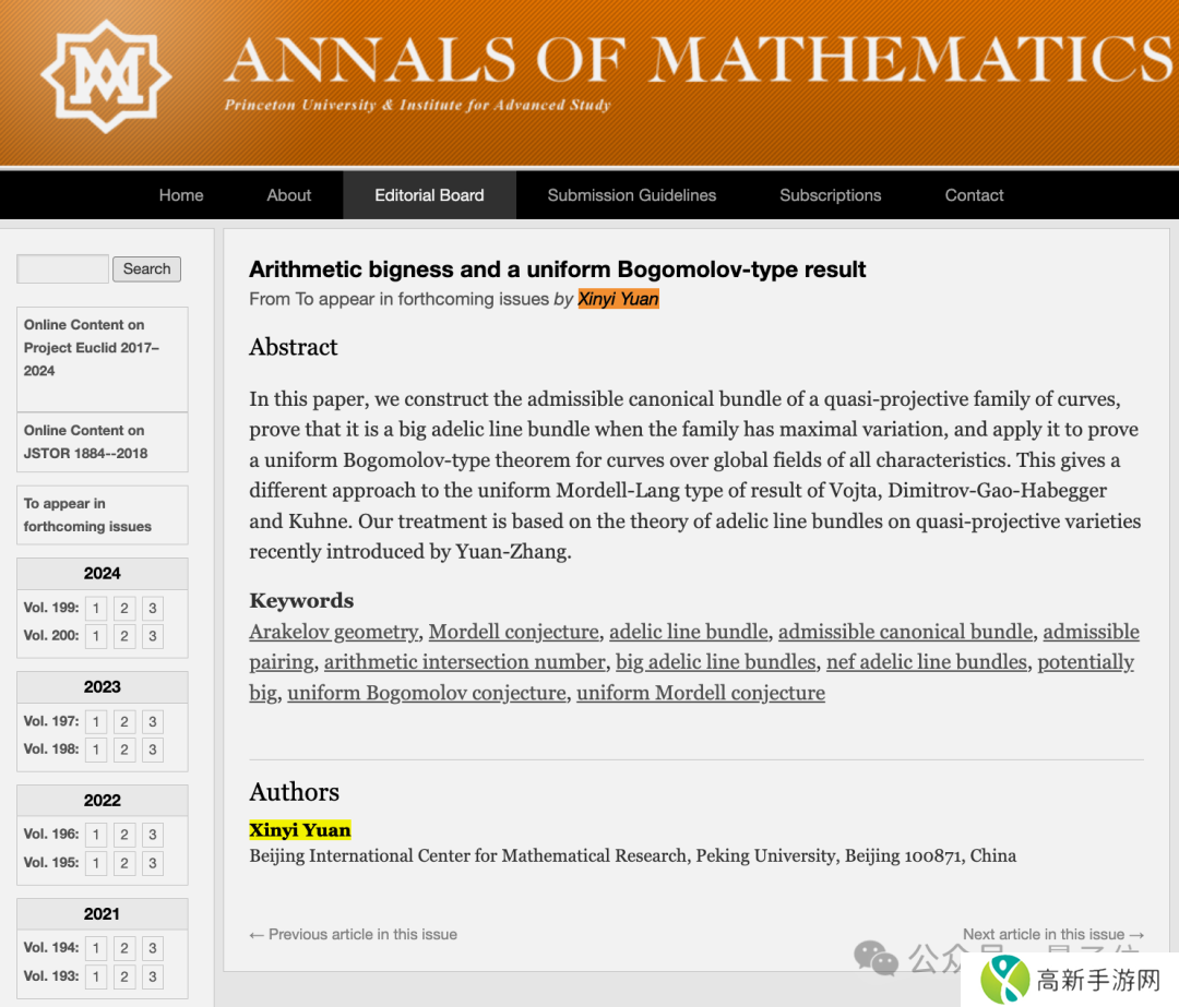 四大顶刊之一的《数学年刊》,正式接收北大袁新意独作论文。在困扰数学界多年的 Uniform Bogomolov 猜想问题上取得重要进展。