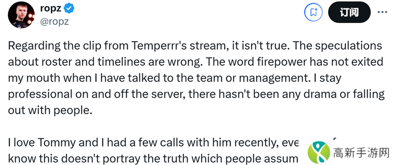 “关于Temperrr直播中的那段视频内容,那不是真的。有关阵容和时间线的猜测都是错误的。我在与战队或管理层交流时,从未说过‘火力’这个词。无论在游戏内还是现实生活中,我都保持专业态度,并没有和任何人发生过矛盾或不愉快。