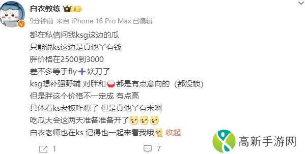 虎扑01月07日讯 白衣爆料小胖价格在2500到3000 ,差不多等于fly加妖刀了,原文如下:都在私信问我ksg这边的瓜只能说ks这边是真他丫有钱胖价格在2500到3000差不多等于fly➕妖刀了k
