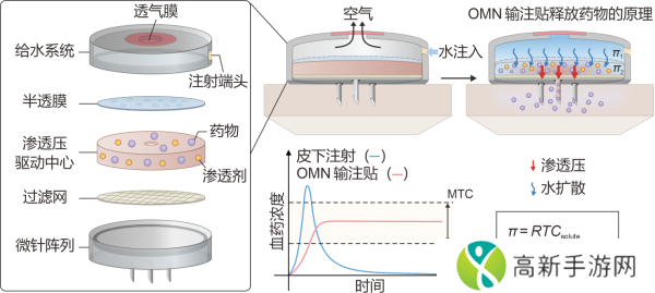 该输注贴利用腔体内的渗透压差将药物以恒定的速率通过空心微针阵列注入体内,来维持稳定的血药浓度以增强药物疗效并减少毒副作用。