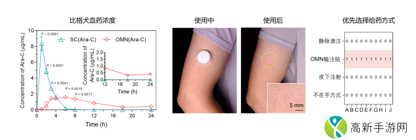 本站 12 月 4 日消息,据浙江大学药学院官方消息,浙江大学药学院、浙江大学金华研究院、先进药物递释系统全国重点实验室顾臻教授、张宇琪研究员、俞计成研究员团队联合浙江大学医学院附属第一医院、首都医科大学附属北京朝阳医院主鸿鹄主任医师团队,首次报道了一款贴敷式输注贴,可实现大剂量药物微创且稳定的体内输注。