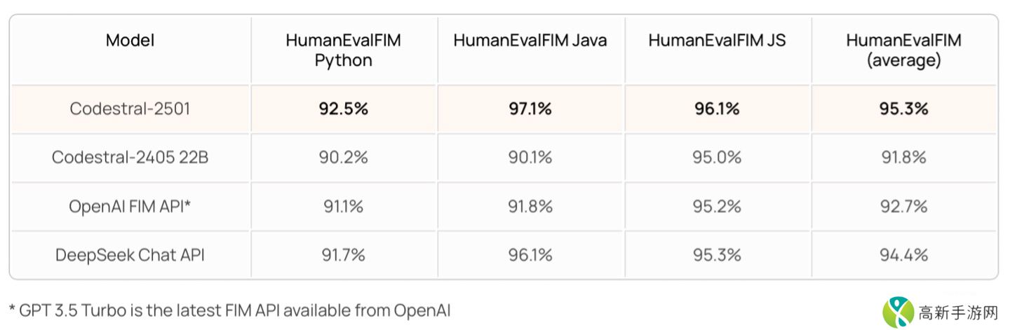 Mistral AI 声称,Codestral 25.01版本在 Fill-In-the-Middle(FIM)任务中刷新了多项基准测试记录,特别是在 FIM 的 Pass@1 测试中,平均通过率达到 95.3%,显示出该模型在生成单行代码方面的强大能力。