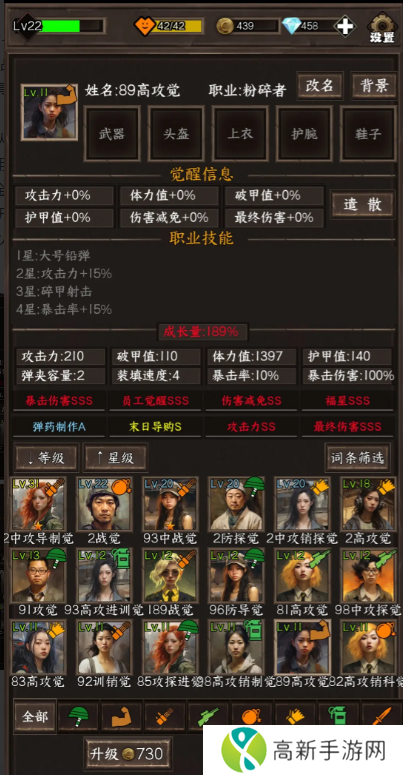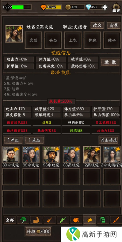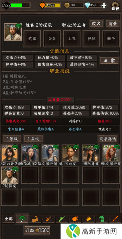 主要词条:伤害减免 员工觉醒(如果2个都是3S成长量在高点的话,有没有攻击词条都行,因为伤害太低了,而且攻击范围1)