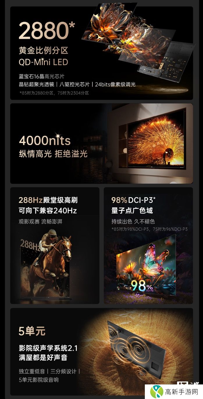 85 英寸版本为2880 分区、75 英寸为2304 分区