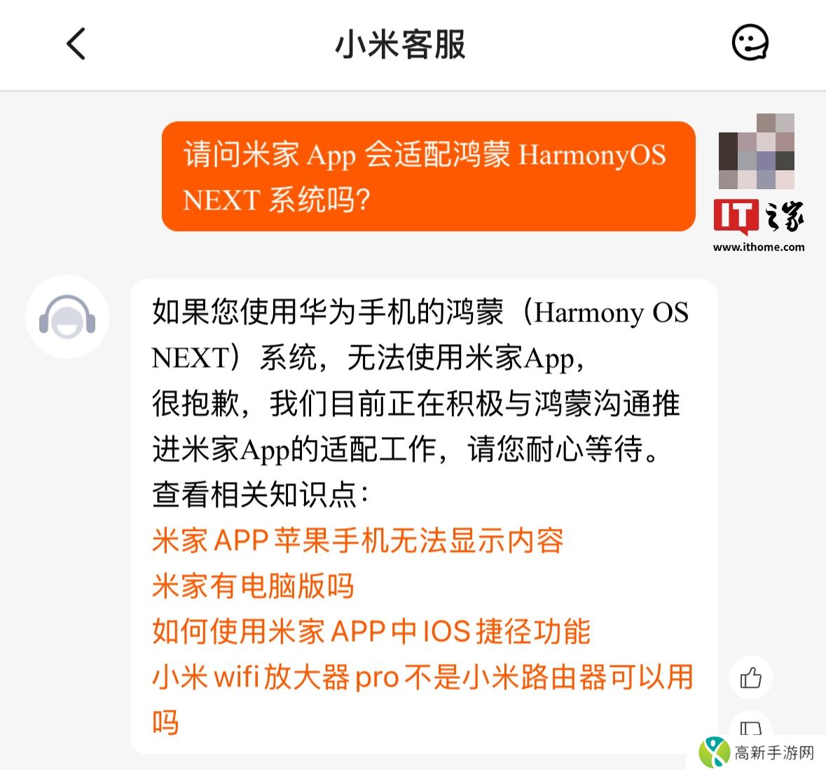 小米客服:目前正积极与鸿蒙沟通推进米家 App 适配工作