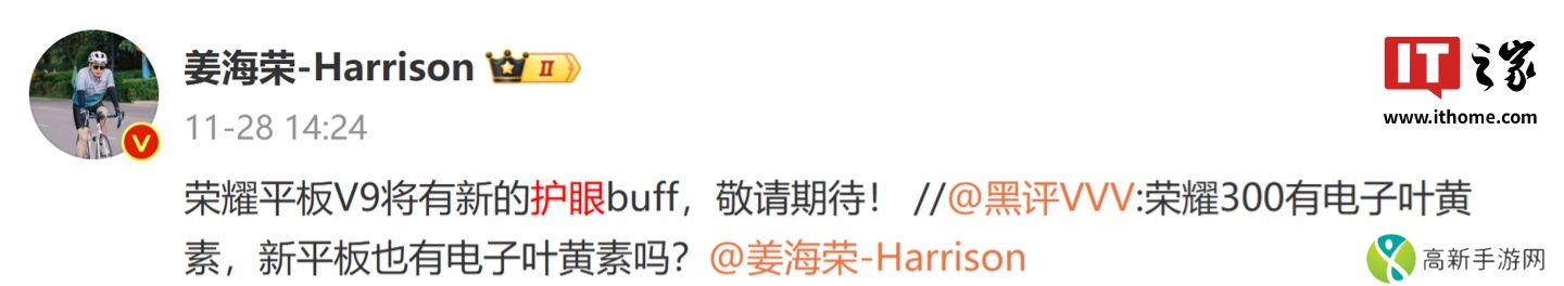 荣耀终端有限公司中国区 CMO 姜海荣此前透露,“荣耀平板 V9 将有新的护眼 buff”。