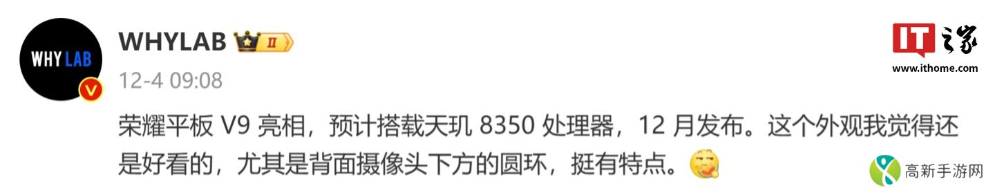 本站注意到,博主@WHYLAB 称荣耀平板 V9 预计搭载天玑 8350 处理器。