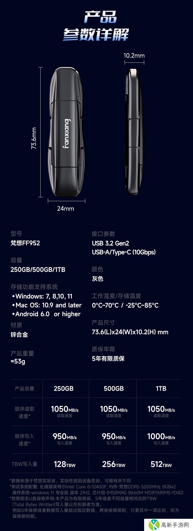 梵想固态 U 盘 FF952,USB-A、Type-c 双接口支持大部分智能设备,支持 iPhone 15 Pro、15 Pro Max 等手机 ProRes 视频录制,支持“Win To Go”随身携带系统。