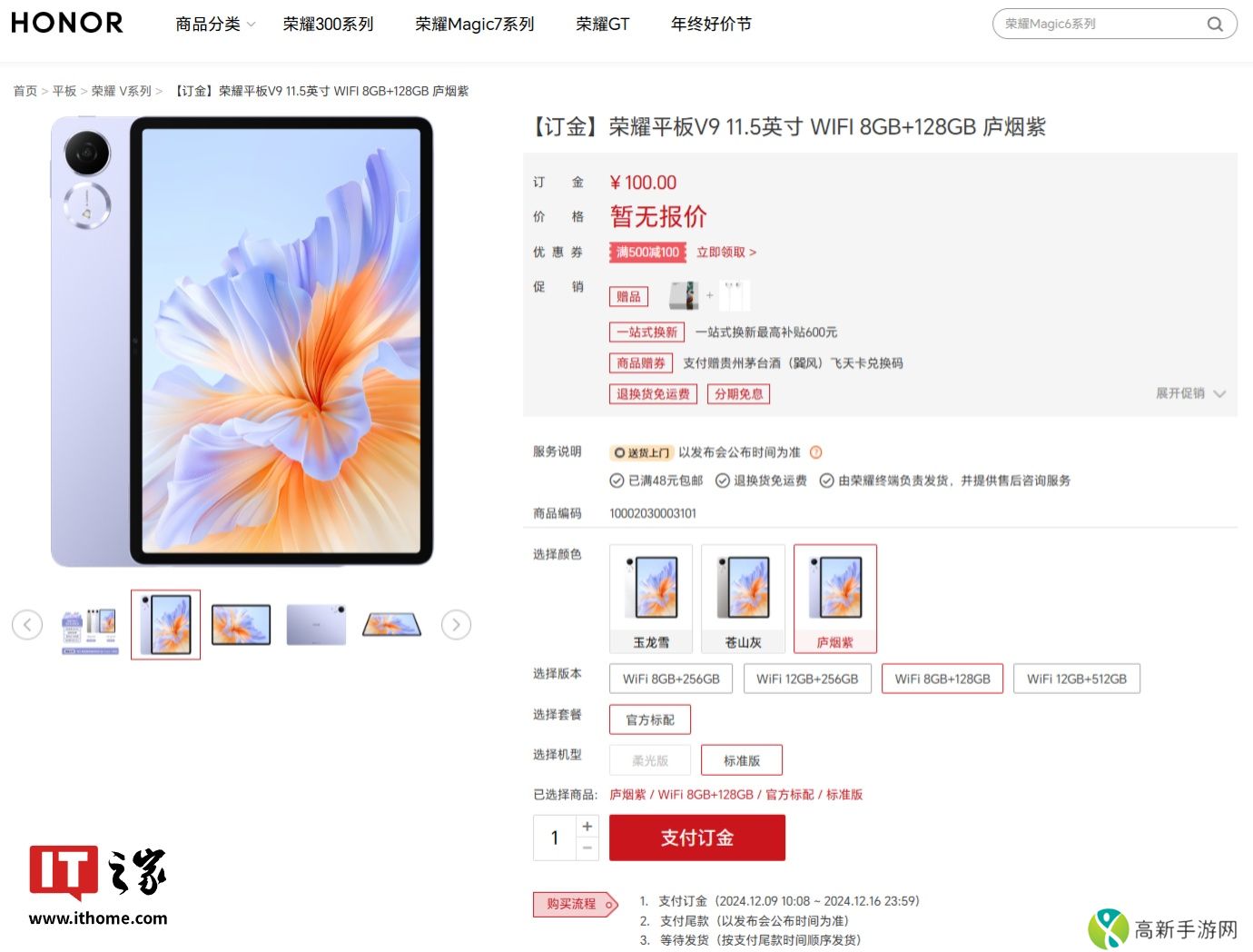 据本站此前报道,荣耀平板 V9已上架荣耀官网开启预约,系列新机将提供 4 种存储规格、拥有柔光版、标准版 2 种屏幕形态。此外,荣耀工作人员 @林林-一枝小白兔 还透露了新平板部分细节信息:厚度为6.11mm,拥有 Magic Pencil 3和亲选键盘等配件。