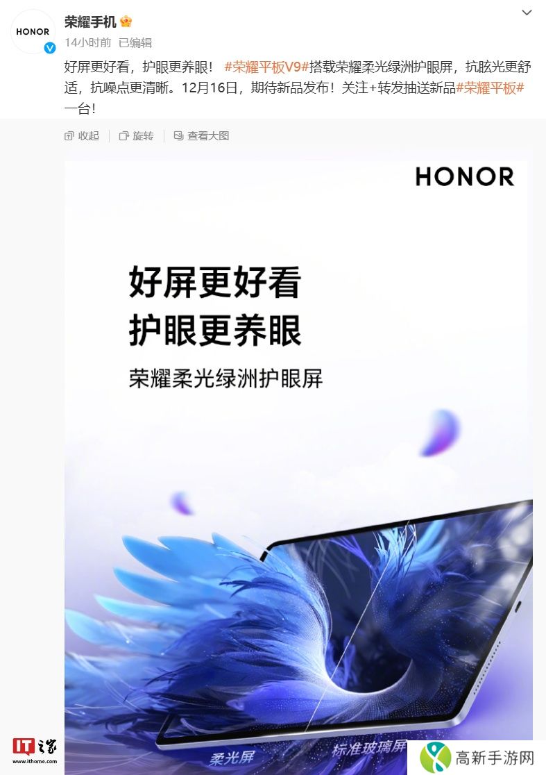 荣耀平板 V9 搭载“荣耀柔光绿洲护眼屏”,宣称具备抗眩光 / 噪点特性