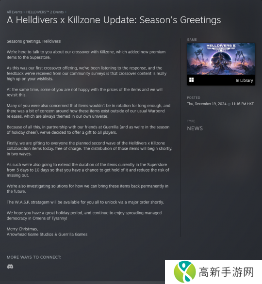“正因如此,我们决定与 Guerrilla 的朋友门合作,(而且正值圣诞佳节)向所有玩家送上一份礼物。首先,我们今天免费向大家赠送计划中的《绝地潜兵 x 杀戮地带》联动第二波商品。这些道具的分发很快就会开始,分两波进行。”