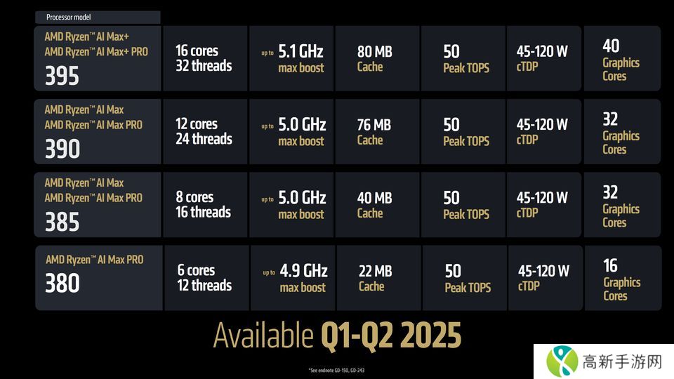 AMD Ryzen AI Max "Strix Halo" 系列包括四款 APU,每款都有标准版和 Pro 版: