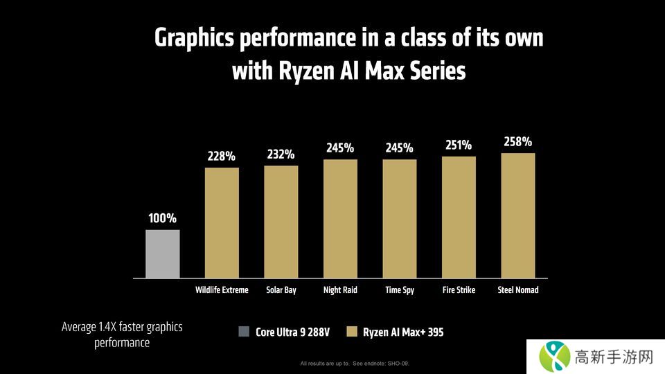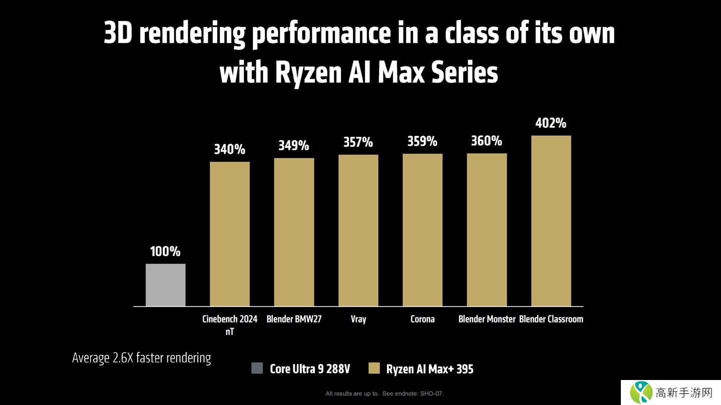 AMD Ryzen AI Max+ 395 的性能表现优异,CPU 性能最高比Intel Lunar Lake "Core Ultra 9 288V"快 3倍(平均 2.6倍),图形性能提升最高158%。