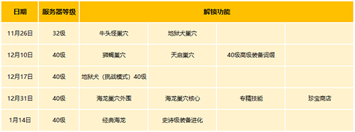 《龙之谷》怀旧服新服“萨芬特拉”的特殊之处,除了海量新服福利外,其等级开放、巢穴开放也具有自己的特色。为了让初入谷的新手玩家也能较为平稳地成长,为今后直面强力魔物奠定坚实的基础,新服“萨芬特拉”中的初始服务器等级为32级,14天后将开放至40级,届时冒险家们除了体验到40级版本的剧情外,狮蝎巢穴、天启巢穴、40级高级装备词缀也将同步开放。后续,地狱犬巢穴(挑战模式)、海龙巢穴(外围+核心)、专精技能、史诗级装备进化,以及顶级难度的经典海龙巢穴,均将基于新服的专属开放节奏陆续开启。冒险家们,享受冒险的快乐,稳扎稳打,勇敢而坚定地踏出每一步吧!