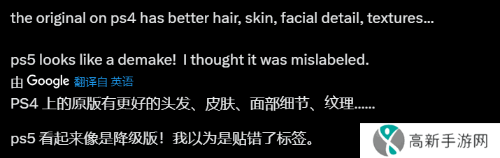有玩家表示,PS5 Pro的复刻版相较于原版游戏而言,表现不尽如人意:“PS4的原版游戏在头发、皮肤、面部细节以及纹理等方面更为出色……相比之下,PS5显得有些逊色。”
