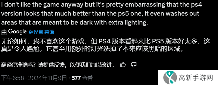 还有玩家指出,PS5 Pro表现不佳的原因在于光影效果:“PS4版本的游戏视觉效果明显优于PS5版本,这令人颇为尴尬。过多的光照反而使原本应该黑暗的地方显得过于明亮。”