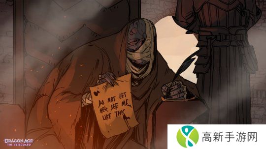 罗兹分享了几张关于赛达斯大陆安德尔费尔斯地区的概念图,那里是守护者的雪顶要塞以及《影障守护者》中霍斯伯格湿地区域的所在地。第三张图着实令人震惊,图中展示了一个裹着绷带的披风身影,其裸露在外的皮肤呈斑驳的紫灰色。此人坐在王座上,身后站着一名守护者保镖,而且这个角色似乎已经无法说话了,只能依靠羽毛笔和一沓羊皮纸来与人交流。他正拿着这样一张纸条面向观者,上面写着:“别让她看到我这个样子。”