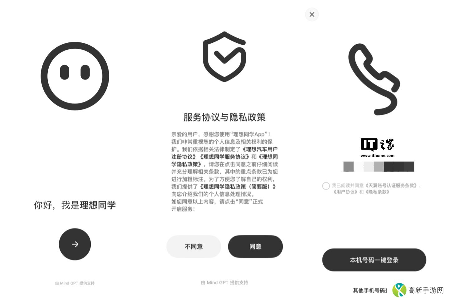 本站实测,打开应用后将进入使用引导,包括产品简介、服务协议与隐私政策、登录(支持本机号码一键登录)。另外,引导页面显示 App 由 Mind GPT 提供支持。