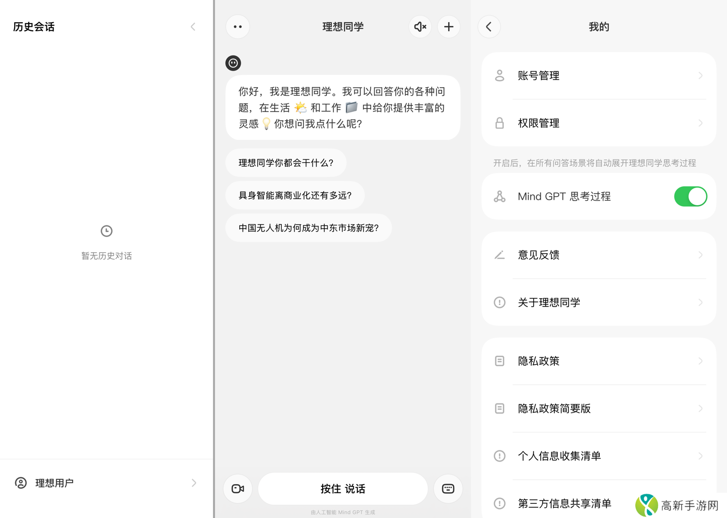 进入应用后会直接进入“理想同学”的交流功能页面,可在此直接和理想同学交流,支持技能查询、知识问答、长英文词句翻译、文本生成等。向右滑会进入“历史会话”页面,继续点击页面底部的“理想用户”则会进入“我的”功能页面,提供账号管理、权限管理等设置内容。