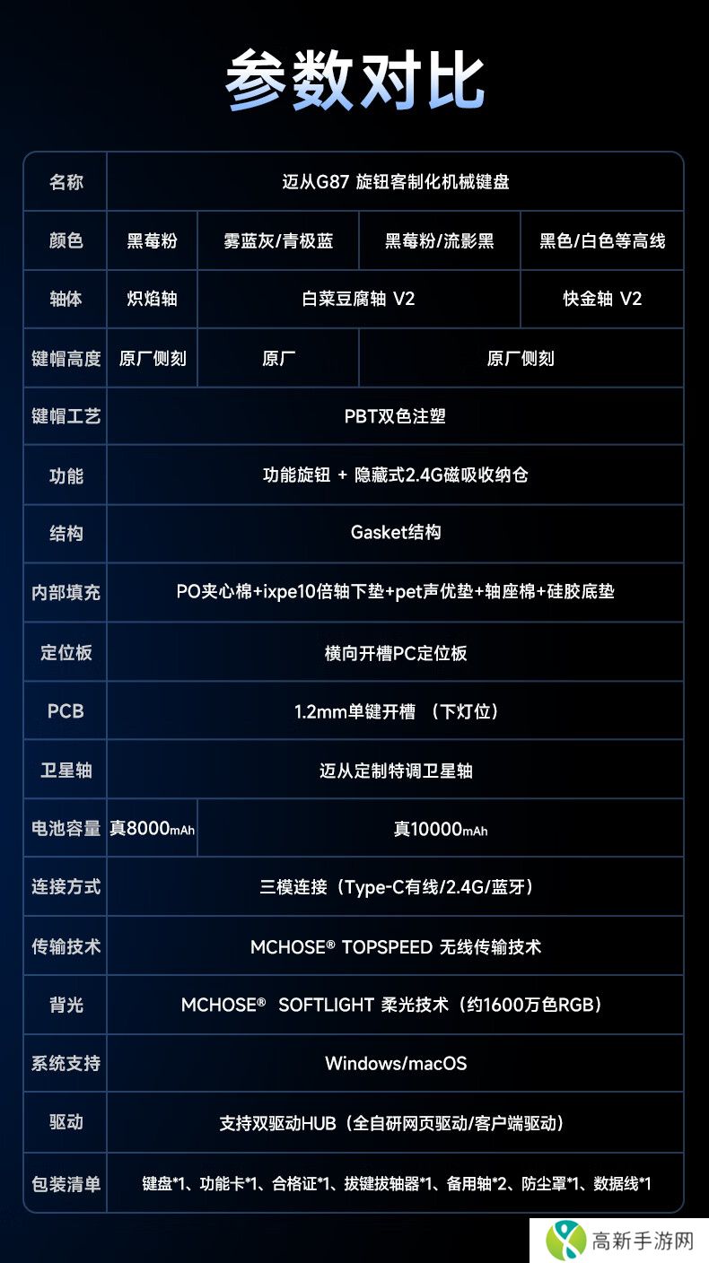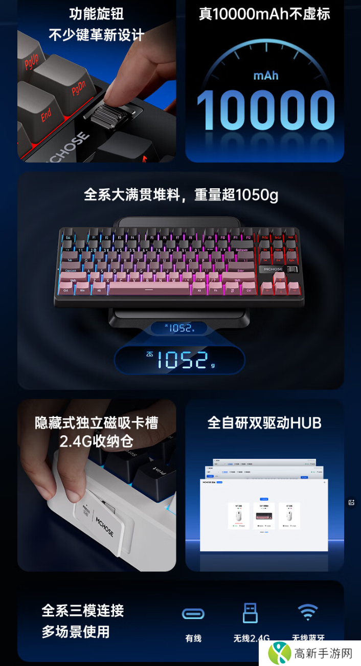 据介绍,迈从 G87 机械键盘电池容量最大为 10000mAh;支持有线 / 2.4G / 蓝牙三模连接,其配有隐藏式独立磁吸卡槽 2.4G 收纳仓,支持网页 / 客户端驱动;另外,键盘的音量旋钮则位于方向键右上处。