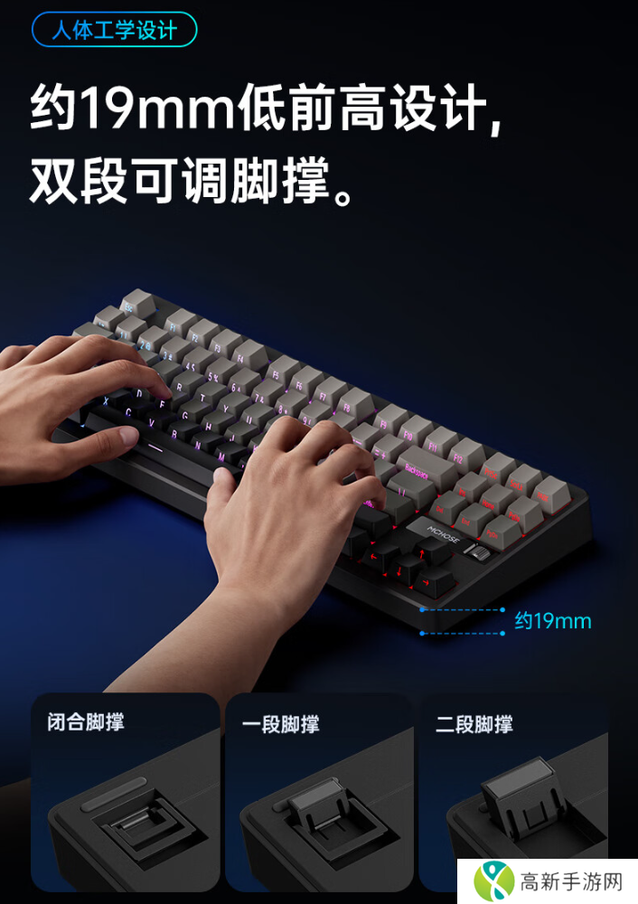 迈从 G87 机械键盘采用 Gasket 结构设计,拥有 PO 夹心棉 + ixpe 10 倍轴下垫 + pet 声优垫 + 轴座棉 + 特制硅胶底垫五层填充;键盘前高 19mm,同时配有两段可调脚撑。