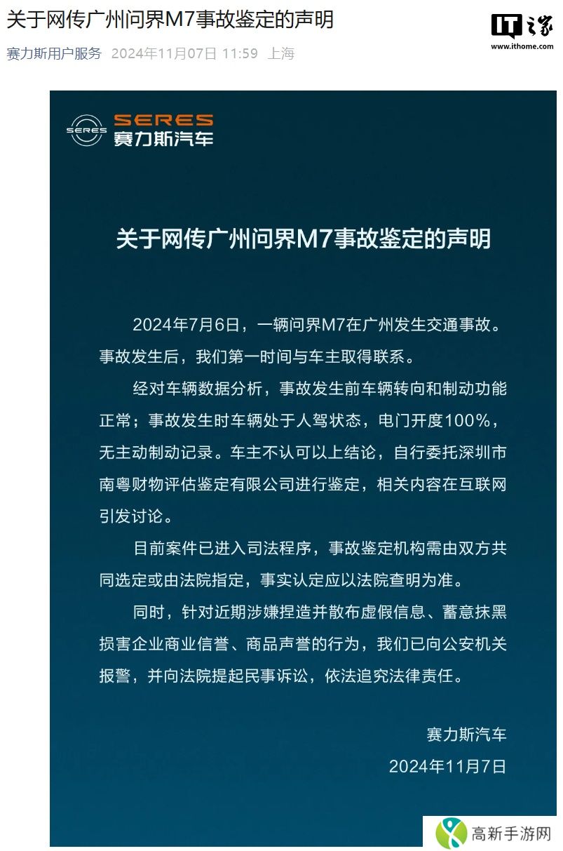 2024 年 7 月 6 日,一辆问界 M7 在广州发生交通事故。当年 11 月,该事故车主在社交媒体上公布了一份南粤评估出具的鉴定报告,该报告鉴定结论认为,事故车发生车辆事故(碰撞)的前 5 秒钟内,驾驶员踩刹车踏板,但刹车踏板失灵;赛力斯出具的事故报告的数据及结论存在人为修改,不完整、不真实等。