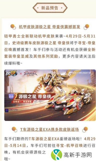 《QQ 飞车手游》宣布与铠甲勇士合作,史诗级赛车皮肤源极之星帝皇侠将于 4 月 29 日-5 月 31 日推出,官方还放出了首段 CG。玩家参与活动还有机会获得全新套装帝皇圣威及其他系列奖励。