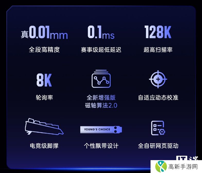 官方表示,迈从 Ace 68 电竞磁轴键盘天王磁轴标准版与电竞版可实现 0.01mm 精度;蓝冰磁轴版本开启狂暴模式,通过混轴适配高性能轴体可实现 0.01mm 精度。全系均可达 8K 轮询率 + 128K 超高扫描率 + 0.1ms 赛事级超低延迟。
