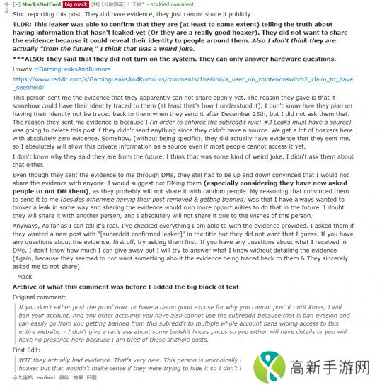 大部分网友觉得“NextHandheld”是一个**,这个帖子也是个“钓鱼贴”,于是便向版主进行了举报,版主按照subreddit的规则要求爆料人出示证据,否则就将删除该贴文。出人意料的是,“NextHandheld”真向版主出示了证据,版主也验证了这些证据,但出于某些原因这些证据无法向公众展示,据称是因为这可能会暴露“NextHandheld”的身份。