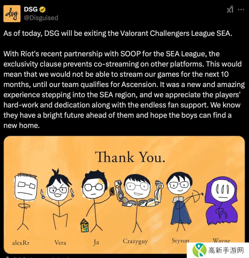 东南亚挑战者联赛DSG战队官宣:由于比赛无法直播,决定退出联赛原文大意如下:自今日起,DSG战队将退出东南亚挑战者联赛(Valorant Challengers League SEA)。鉴于Riot