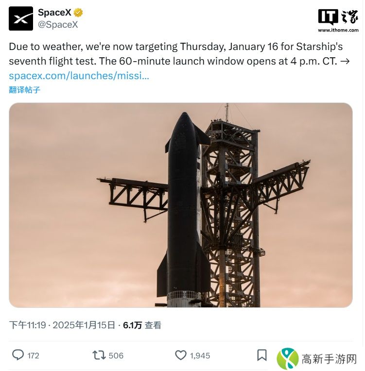 感谢本站网友 yC08 的线索投递! 本站 1 月 15 日消息,SpaceX 官方 X 账号今晚宣布:受天气影响,目前计划于美国中部时间 1 月 16