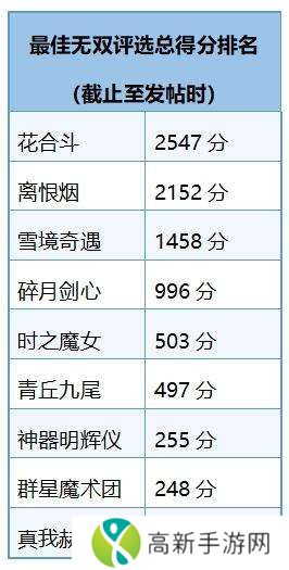 此前采取“前三计分制”投票评选最佳无双皮肤的结果已经出炉。目前排名已经稳定下来,可以宣布前三名分别是不知火舞花合斗、公孙离离恨烟以及甄姬雪境奇遇。具体的分数如下:第一名的投票分布和最终排名高度一致。前