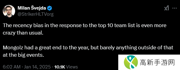 今日,HLTV公布的2024年度最佳战队TOP10再度引发争议。HLTV出品:2024年TOP10战队排名HLTV主编Striker在个人社交媒体账号上分享了对此事的看法和解释。“2024年度最佳战队