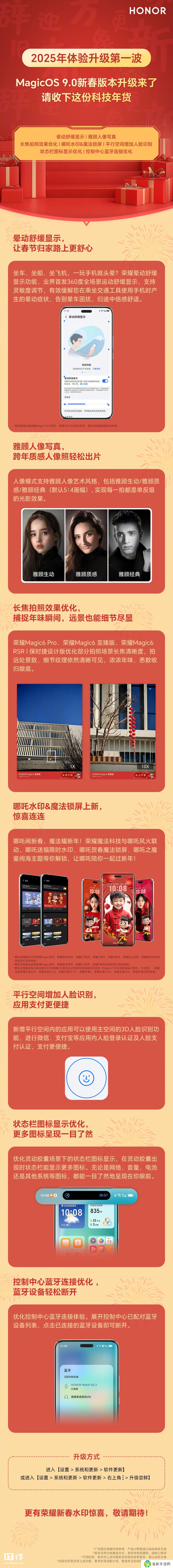 感谢本站网友 朱丶工作室 的线索投递! 本站 1 月 14 日消息,荣耀今日公布了 MagicOS 9 0 新春版本升级内容,本次升级新增晕动舒缓显示、雅