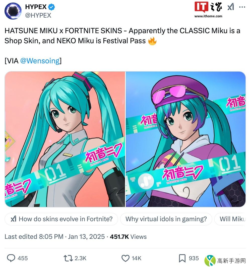 本站 1 月 13 日消息,Epic宣布联动初音未来(Hatsune Miku)角色,从北美时间 1月14日(明天)起为《堡垒之夜》引入两款全新皮肤,不过部分玩家认为相应模型皮肤在《堡垒之夜》游戏引擎