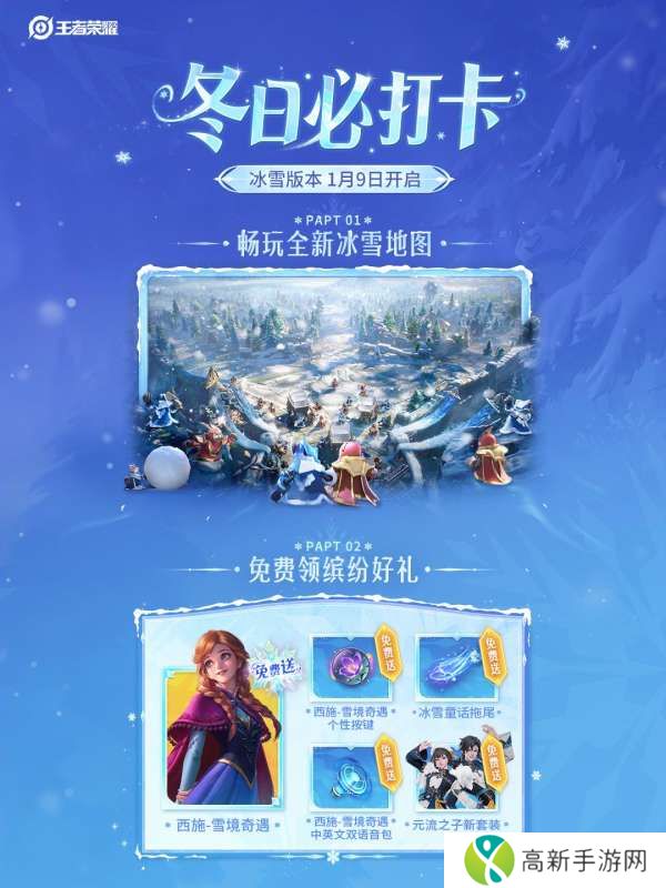 全都免费哦~* 免费体验冰雪峡谷地图——王者首次地图换季* 免费送冰雪奇缘联动皮肤【西施-雪境奇遇】* 免费送绝美大裙摆拖尾的【冰雪童话-拖尾】* 免费体验冬日快乐——冰雪快跑玩法