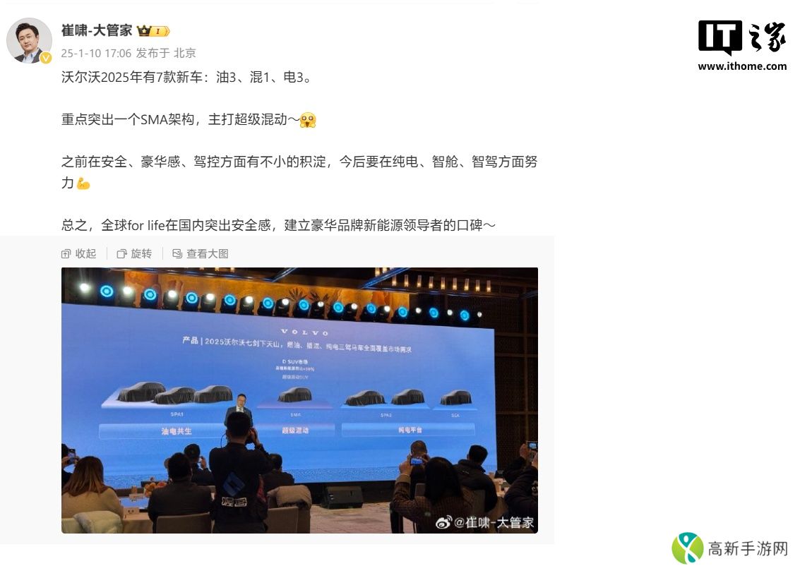 本站 1 月 10 日消息,沃尔沃今日公布了 2025 年的产品规划:推出燃油、插混、纯电三种动力共 7 款新车。官方的 PPT 上喊出的口号,则是“2025 沃尔沃七剑下天山,燃油、插混、纯电三驾马