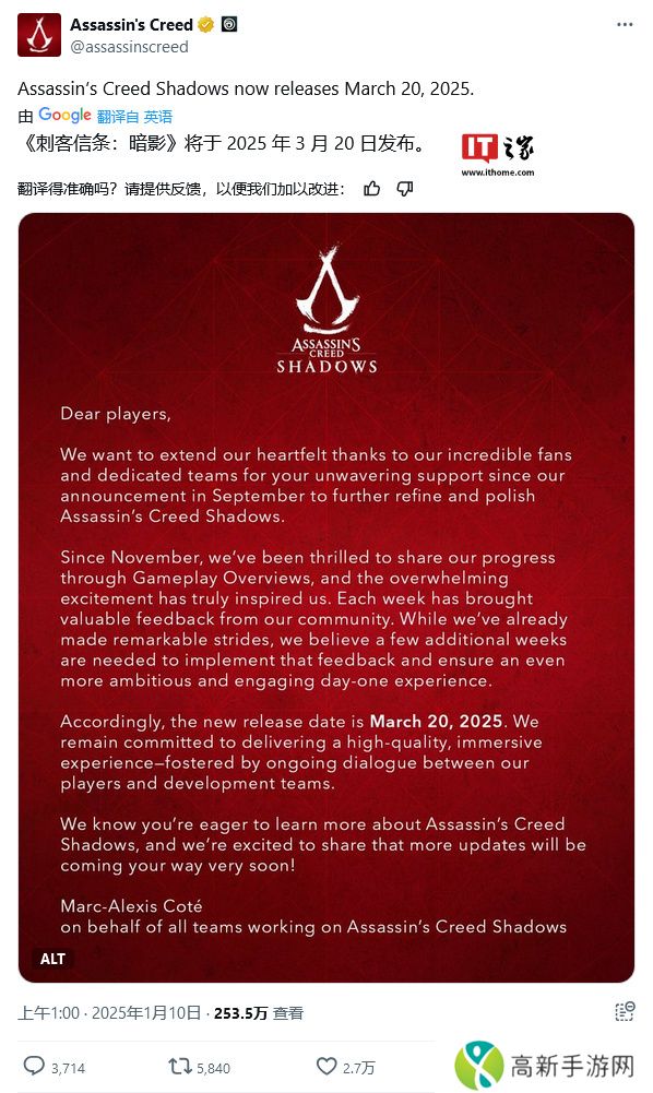 感谢本站网友 华南吴彦祖 的线索投递! 本站 1 月 10 日消息,育碧再次宣布旗下游戏大作《刺客信条:影》跳票,此次延期一个月,由原定的 2025 年
