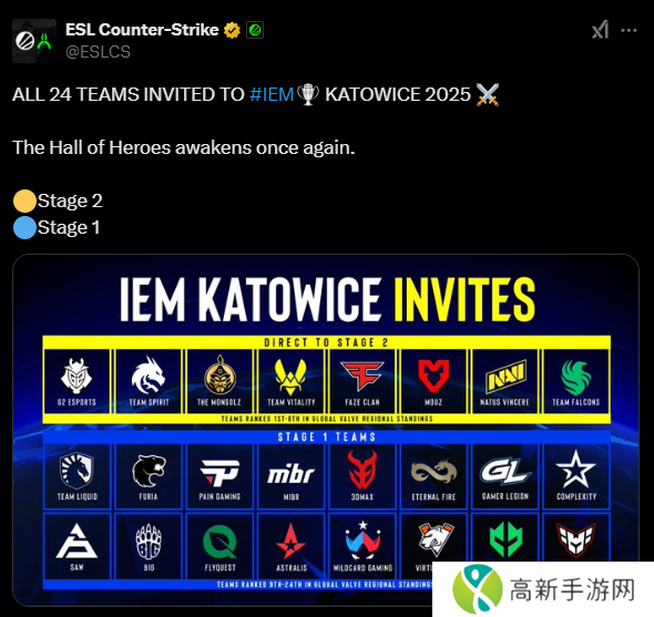 刚刚,赛事主办方ESL公布了IEM 卡托维兹2025的24支直邀战队名单。比赛将分为两个阶段,24支队伍中排名前8的队伍将直邀正赛阶段,而剩余16支队伍将从入围赛(Play-in阶段)打起。直接受邀进