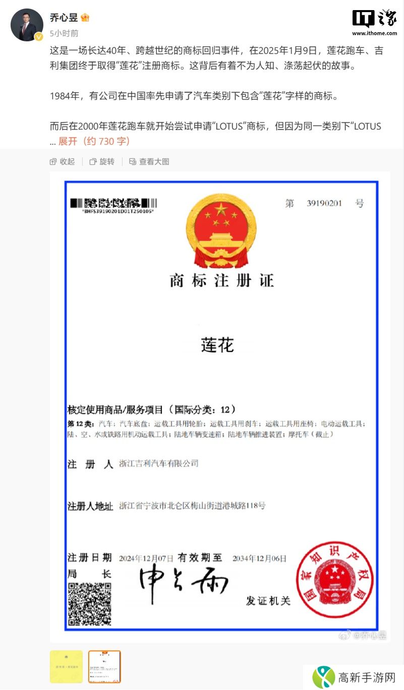 感谢本站网友 咦惹 的线索投递! 本站 1 月 9 日消息,莲花跑车(本站注:原路特斯)市场负责人乔心昱宣布,莲花跑车、吉利集团今日终于取得“莲花”注册商