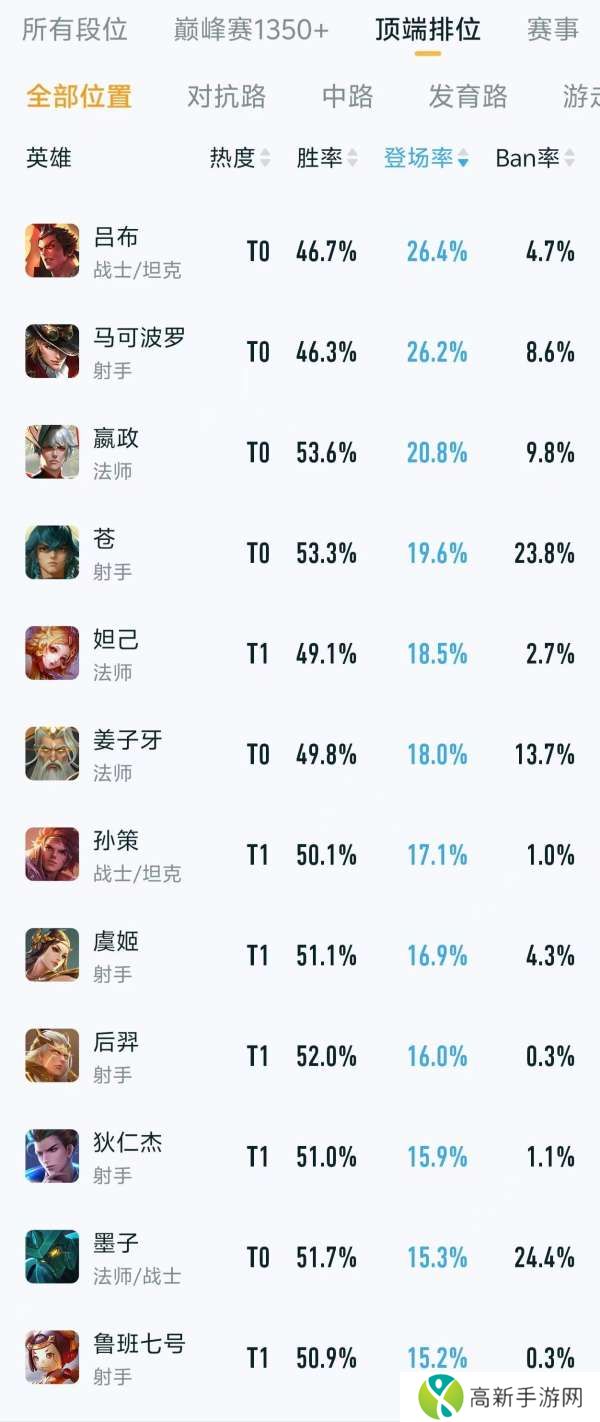 1 7日顶端排位英雄热度排行:女娲、瑶、、朵莉亚、大乔、敖隐位居前五,游走位前十中占据五个位置;黄忠、伽罗、亚连、关羽、项羽位居倒数前五,倒数前十有六位对抗路英雄(马超暂认为是对抗路);1 7日顶端排